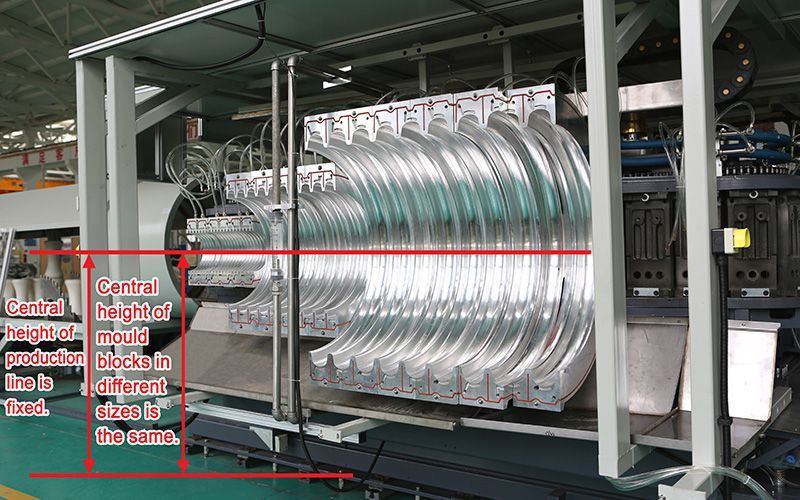 Новейший дизайн гофратора для труб от ZhongyunTech не предусматривает наличие специальной платформы для установки гофратора, тем самым облегчая и ускоряя замену формующих блоков, без необходимости регулировать высоту гофратора.